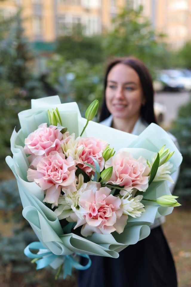 Очаровательный и очень нежный букет из крупных французских роз и ароматных лилий.