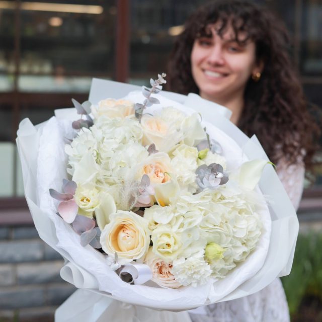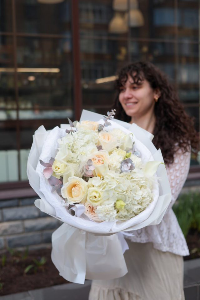 В букете: пышные гортензии, ажурная эустома, одноголовые пионовидные розы, каллы, сухоцветы, крашеный эвкалипт.