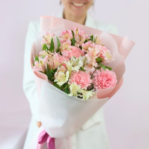 В букете: стойкие диантусы и альстромерия.
