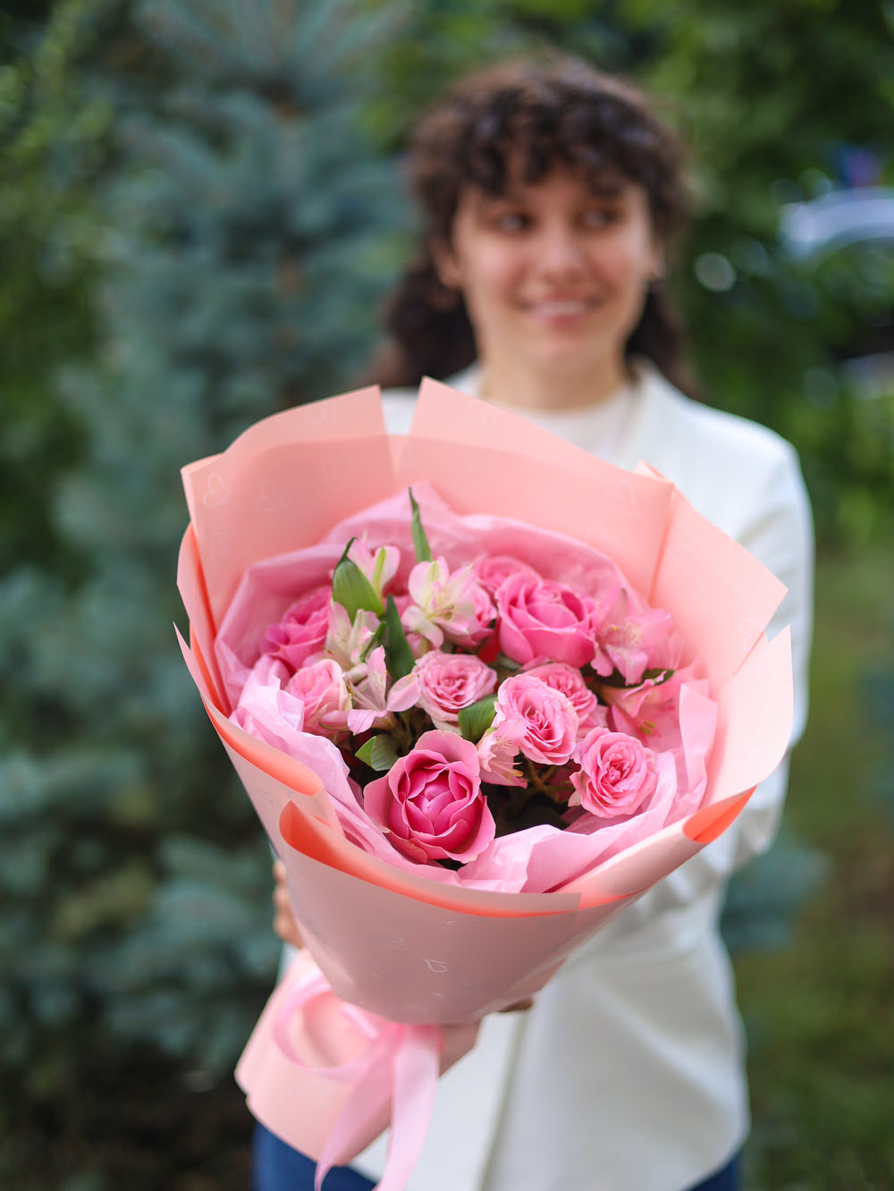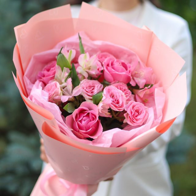 Состав: кустовые и одноголовые розы, стойкая альстромерия.