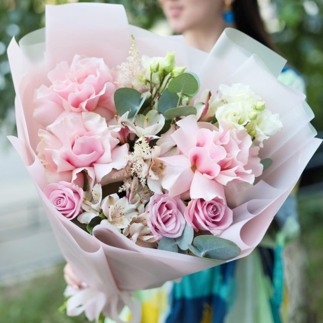 В букете: французские розы, стойкая альстромерия, ажурная эустома, одноголовые розы, сухоцветы, душистый эвкалипт.