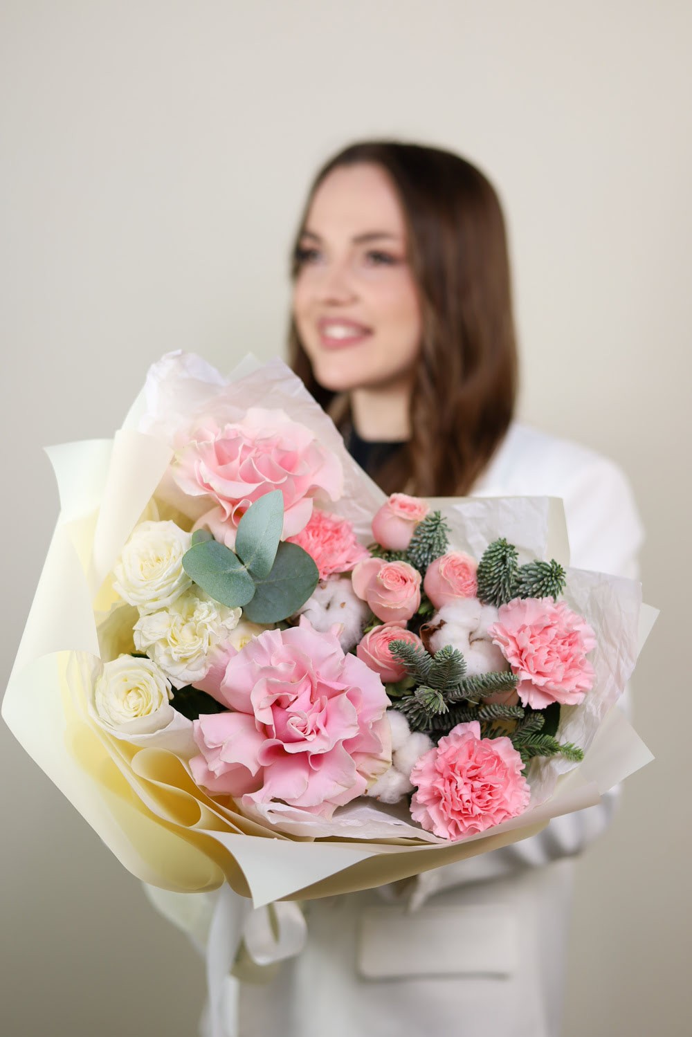 Состав: французские и кустовые розы, стойкие диантусы, натуральный хлопок, ель нобилис. Высота около 50 см.