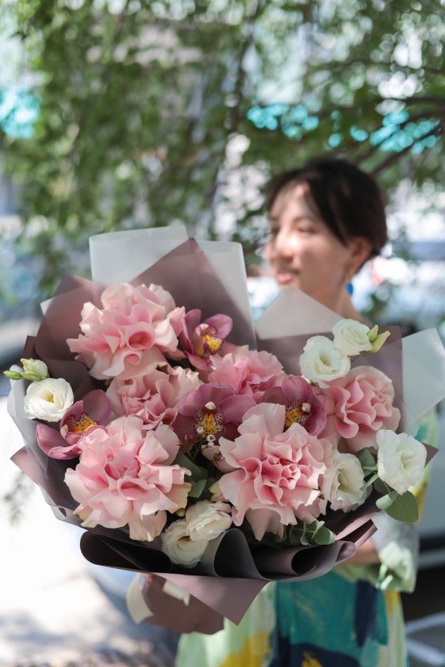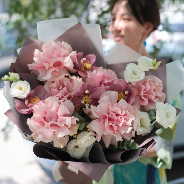 Воздушный букет с орхидеями и французскими розами