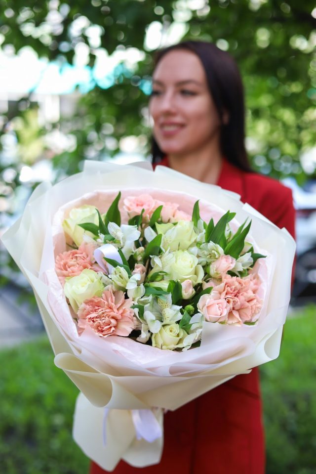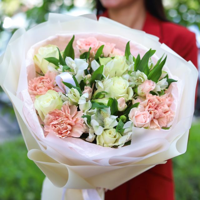 Состав: кустовые розы, стойкие диантусы и альстромерия, одноголовые розы.