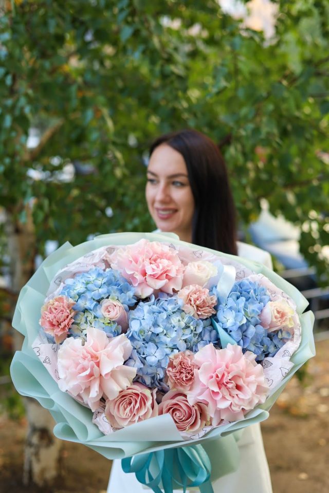 Состав: французские розы, пышные гортензии, одноголовые пионовидные розы, стойкие диантусы.