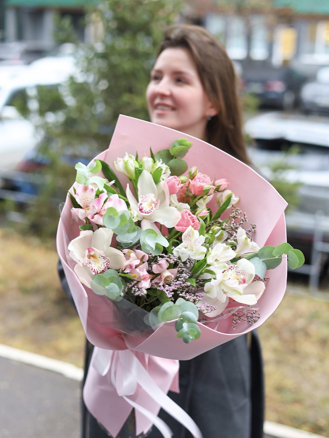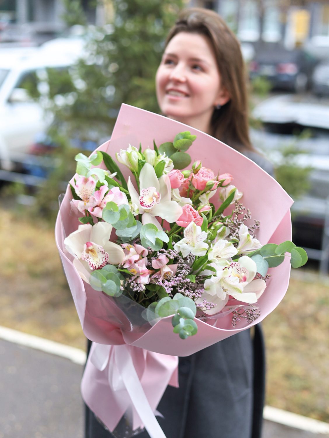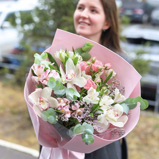 Состав: кустовые розы, стойкие орхидеи, альстромерия, лимониум и эвкалипт.