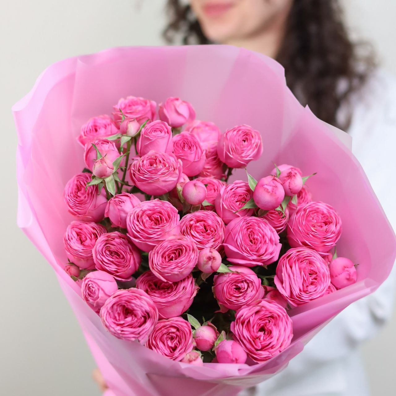 Букет из 5-ти высоких пионовидных кустовых роз в оформлении