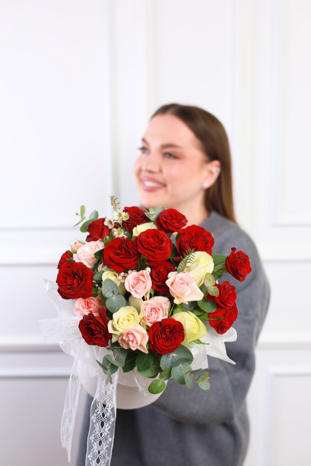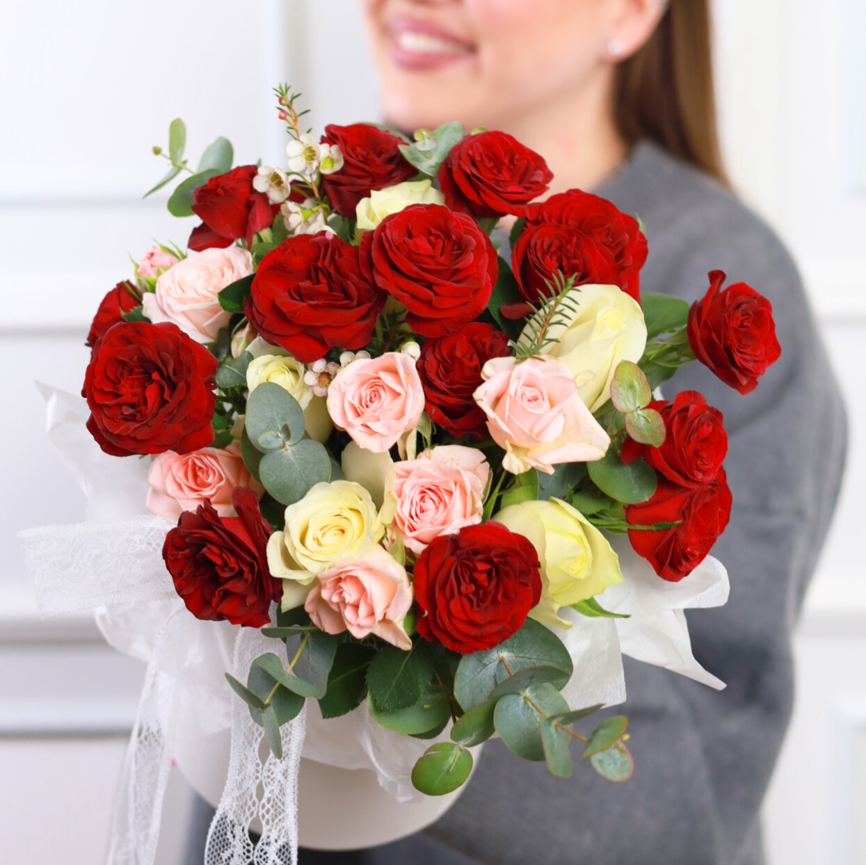 Красивая композиция с кустовыми и одноголовыми розами, эвкалиптом в шляпной коробке.