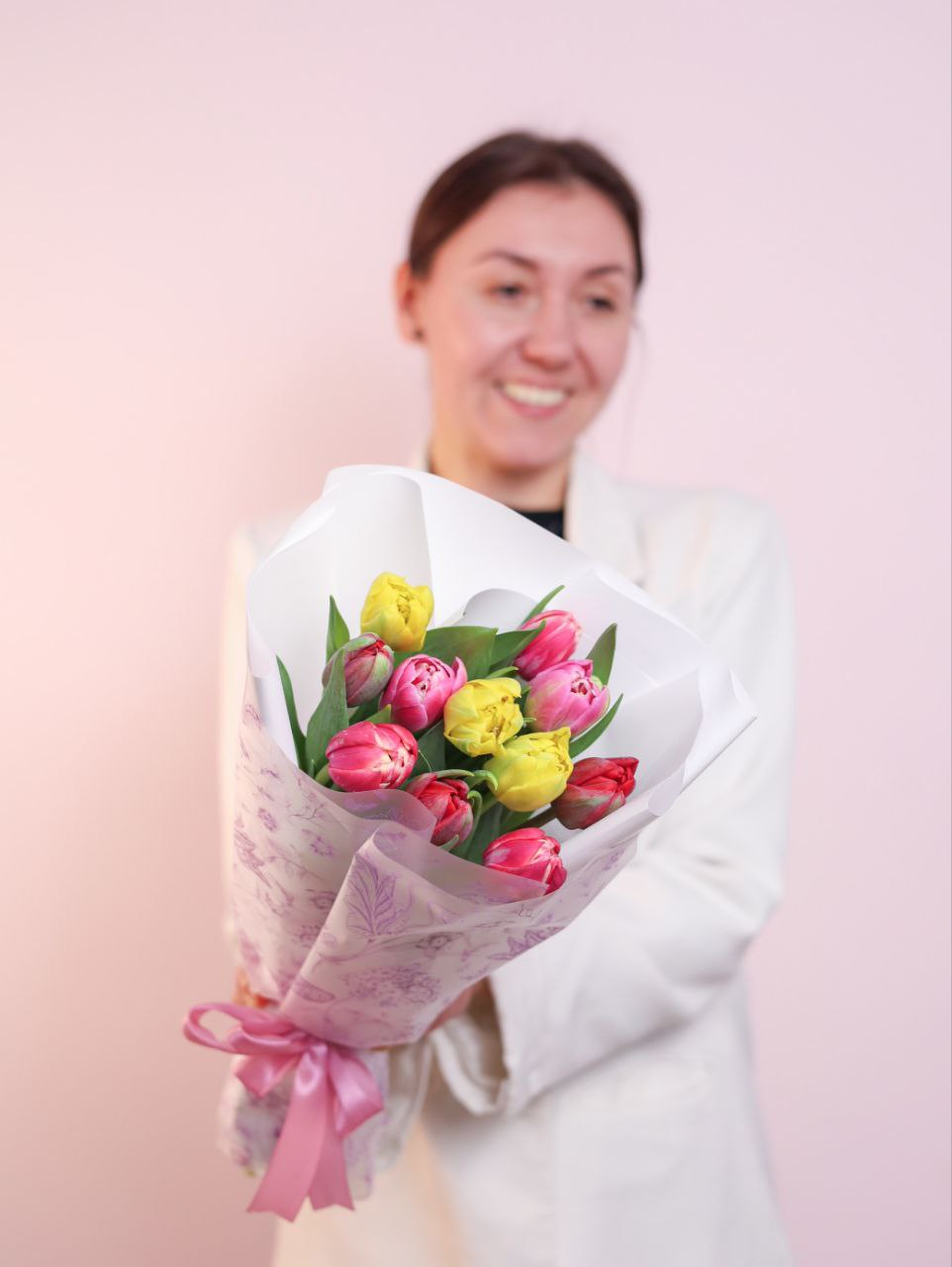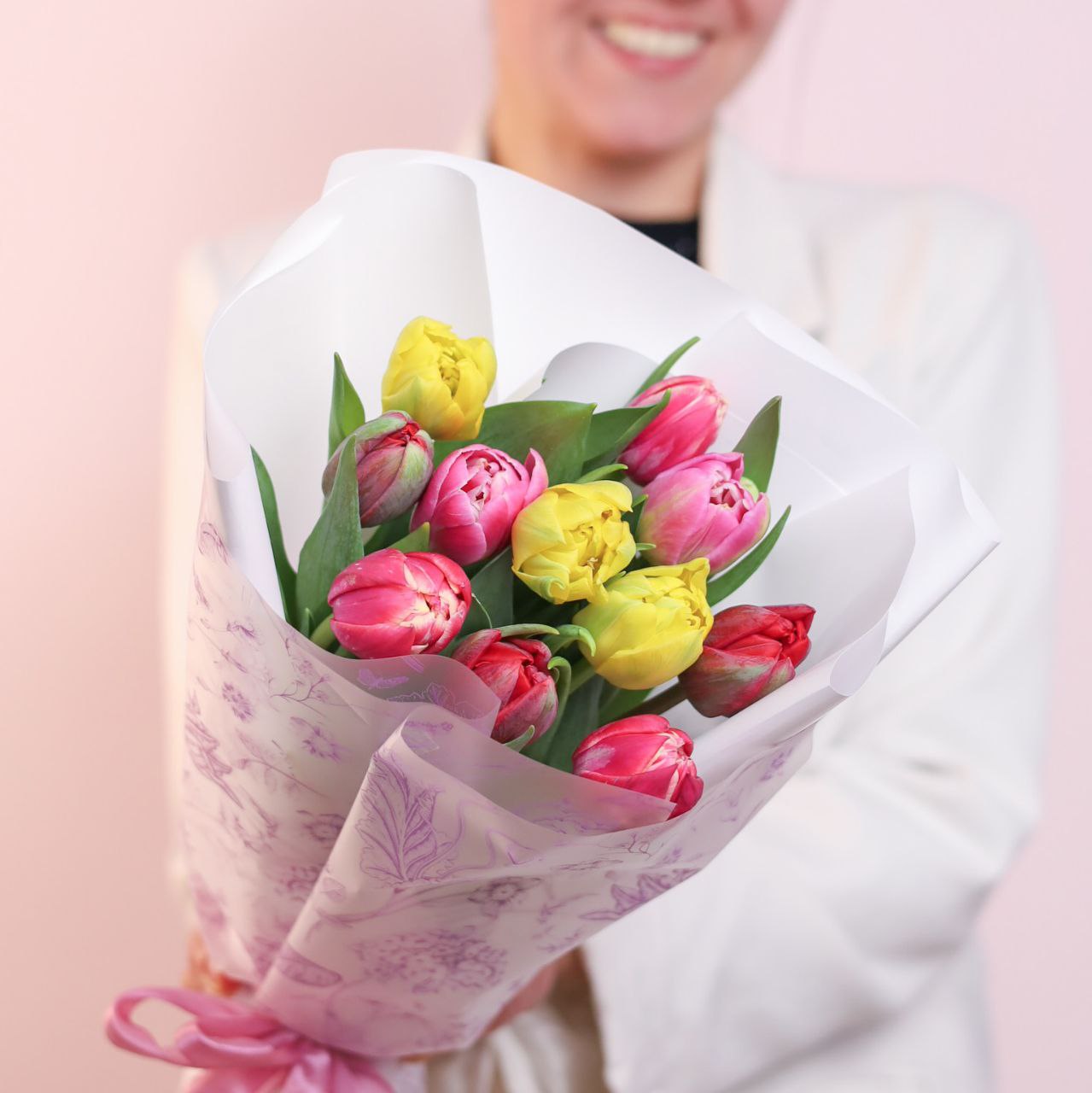 Букет из 11-ти пионовидных тюльпанов микс в оформлении.