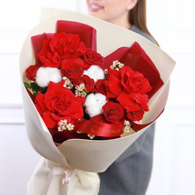 Все букеты собираются максимально похожими, в том числе и оформление.