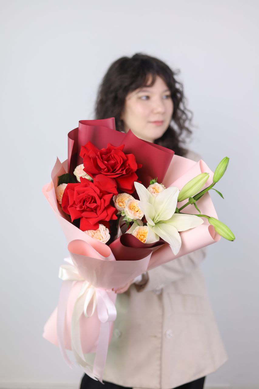 Букет с французской розой, лилией и кустовой розой в оформлении.