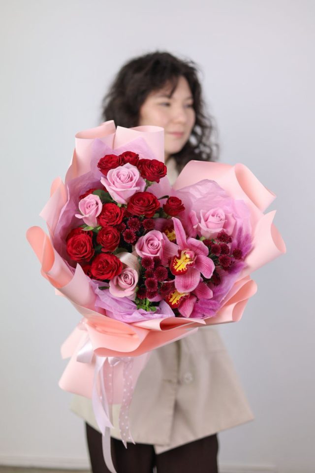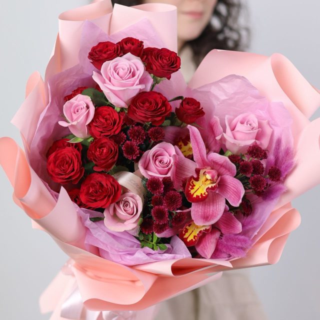 Букет с орхидеей, кустовой розой, хризантемой и розой в оформлении.