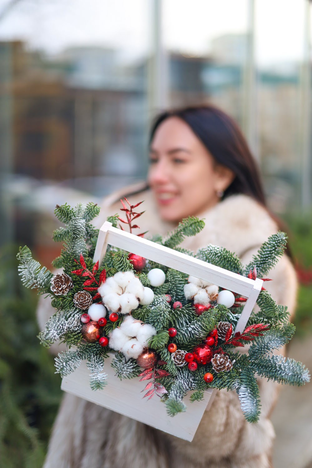Состав: натуральный нобилис, хлопок, новогодний декор, шишки. Высота около 30-35 см.