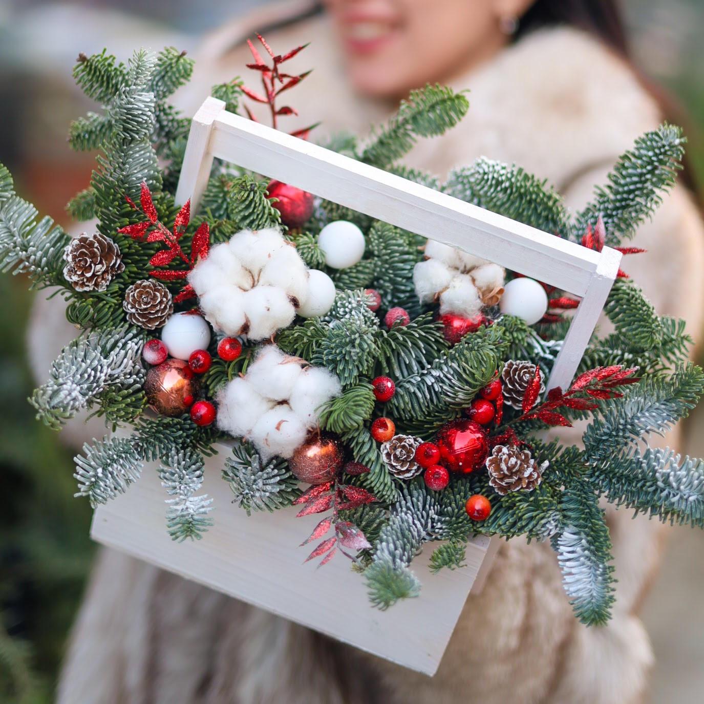 Красивая зимняя композиция в алой гамме в деревянном кашпо.