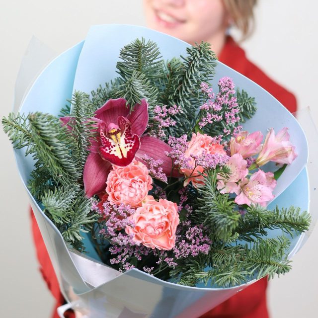 Букет с орхидеей, кустовой розой, альстромерией, лимониумом и елью в оформлении.