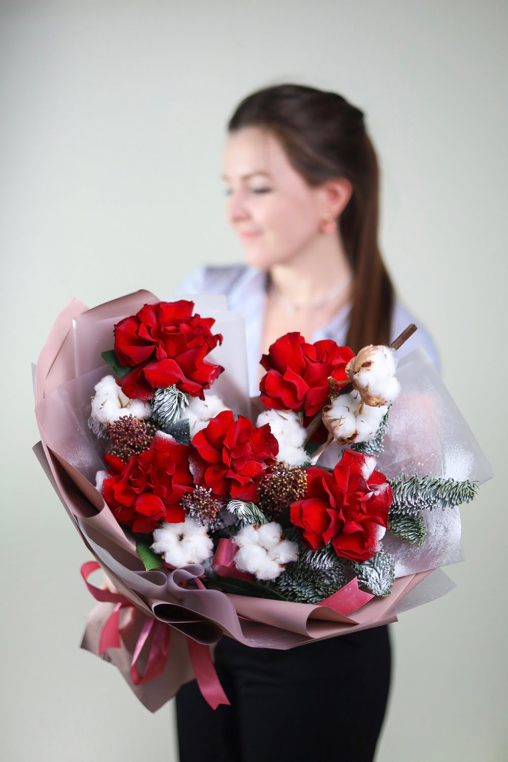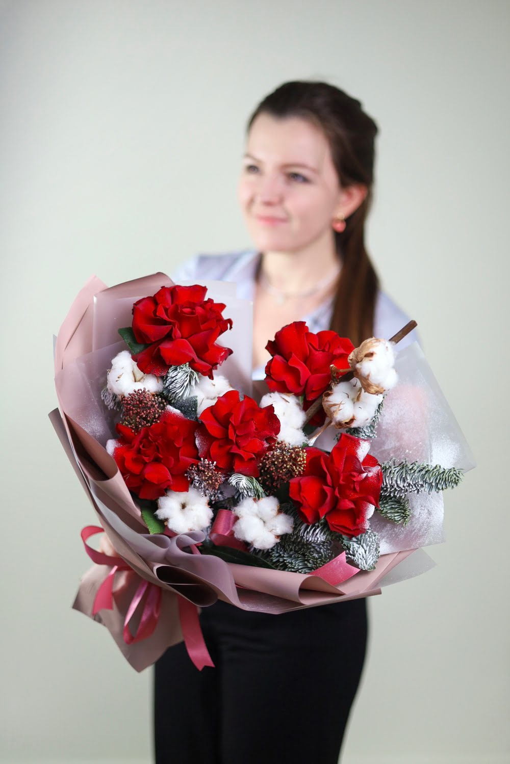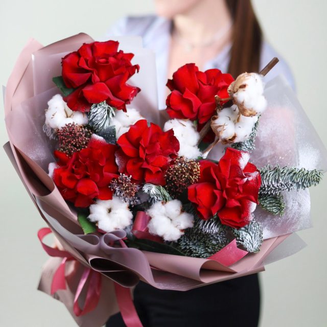 Букет с бордовыми французскими розами, ветками натурального хлопка, датской елью и декоративным наполнителем.
