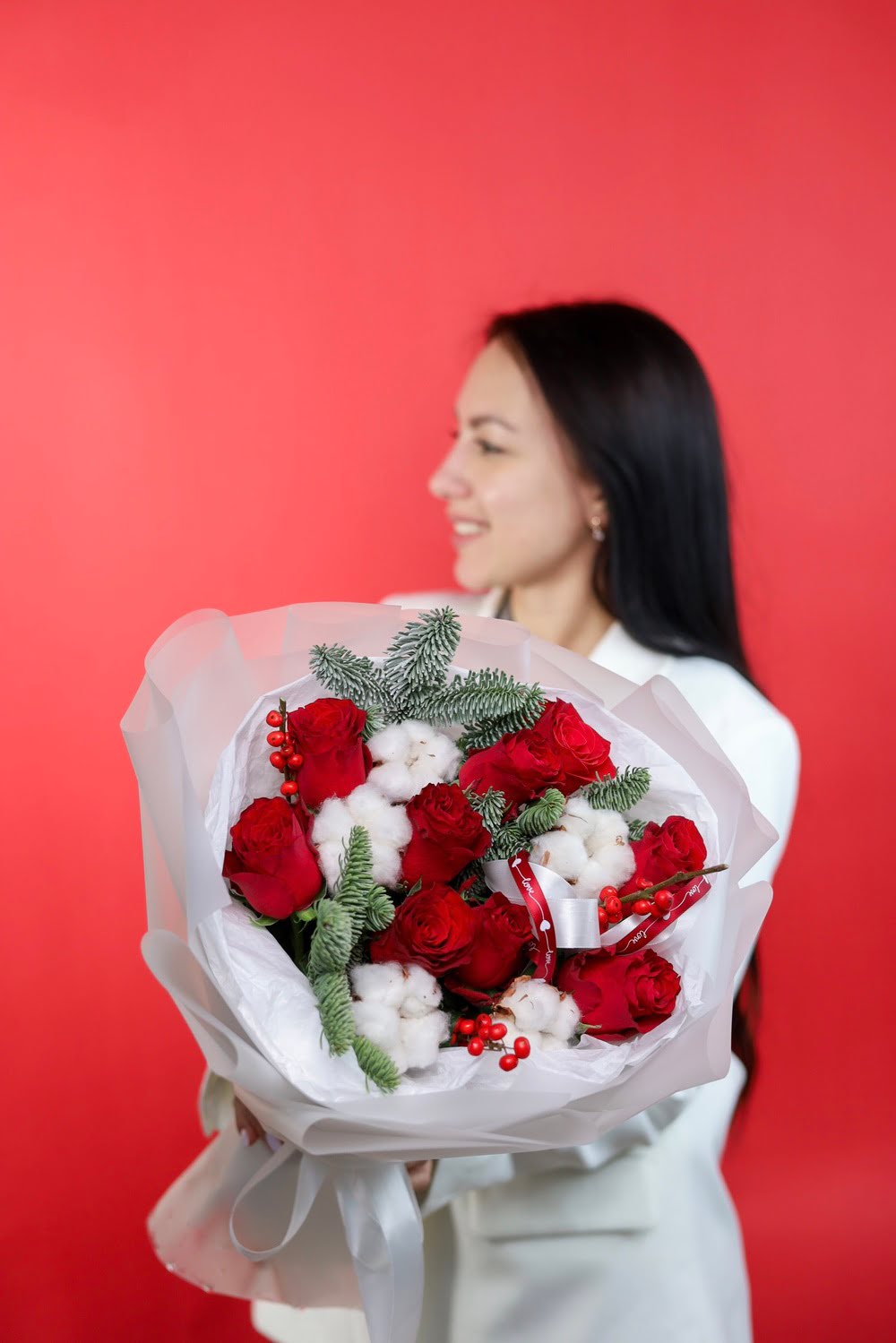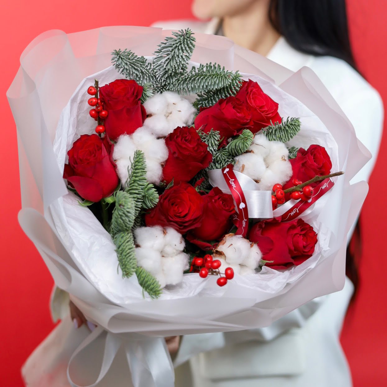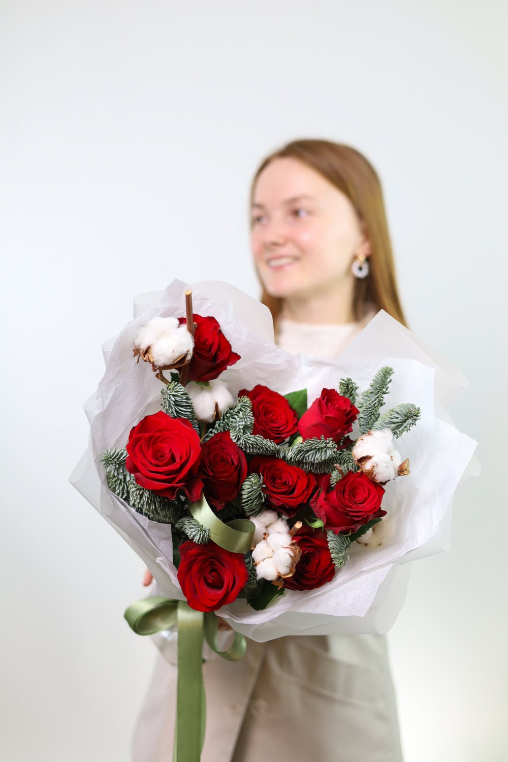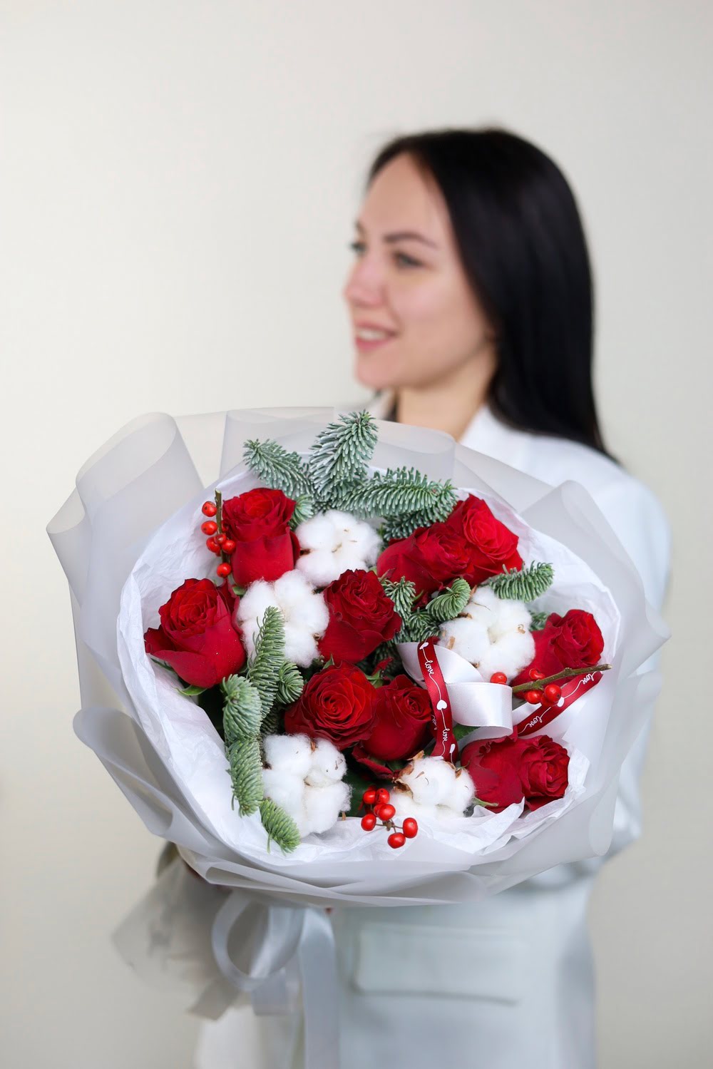 Прекрасный праздничный букет с одноголовыми розами, натуральным хлопком и ароматным нобилисом.