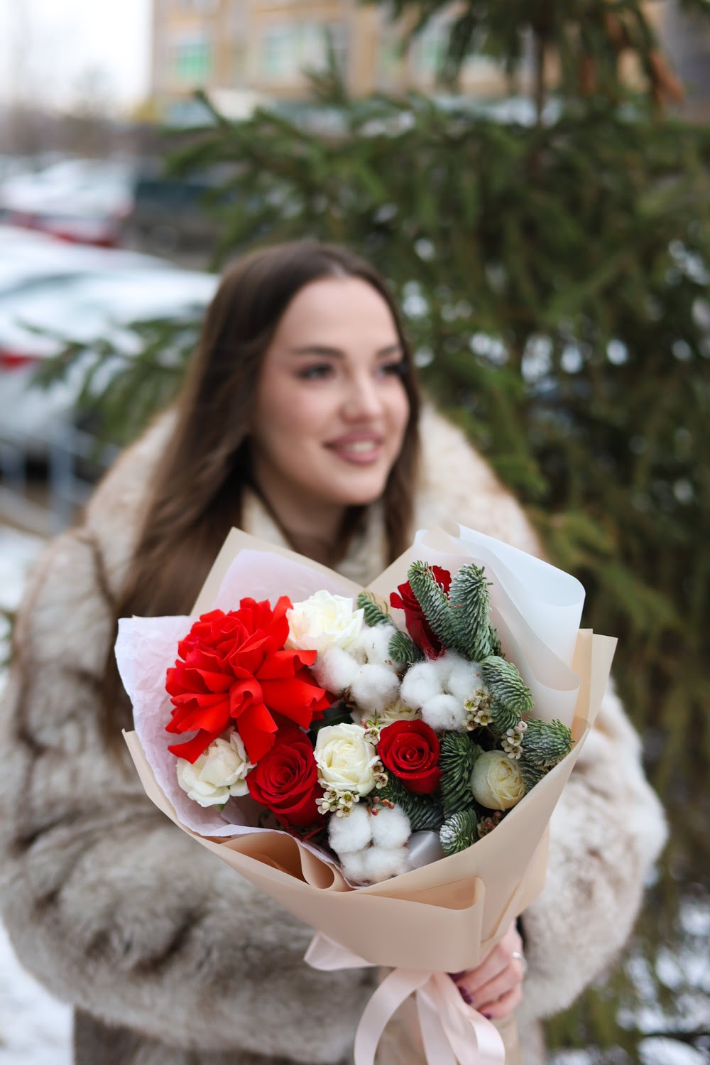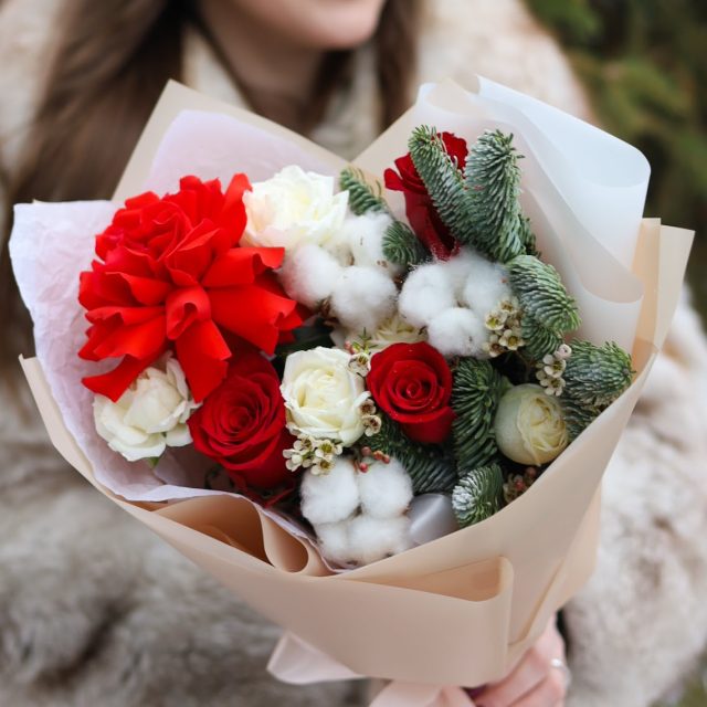 Зимний букет с розами и хлопком