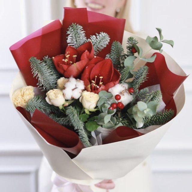 Изящный букет с красным амариллисом, нежными кустовыми розами и декоративными элементами в виде датской ели, хлопка, илекса и эвкалипта