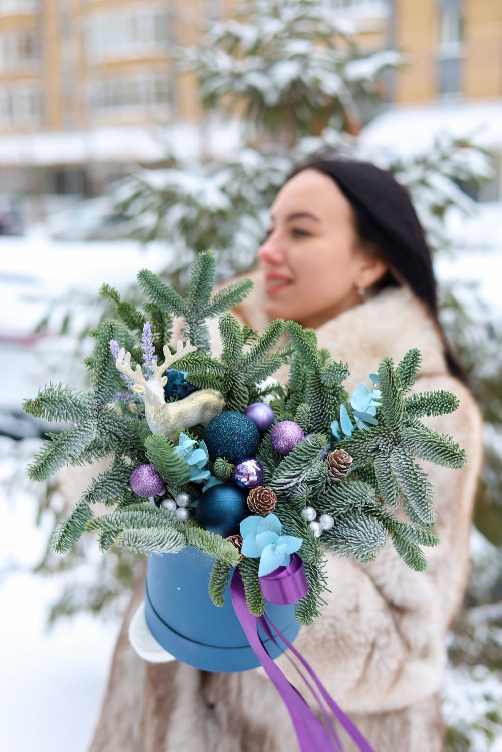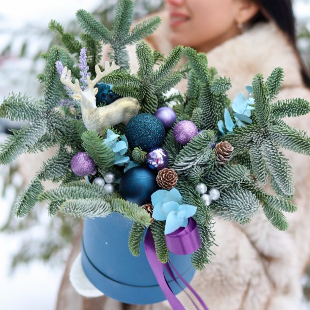 Прекрасная зимняя композиция в сиреново-синей гамме в шляпной коробке.