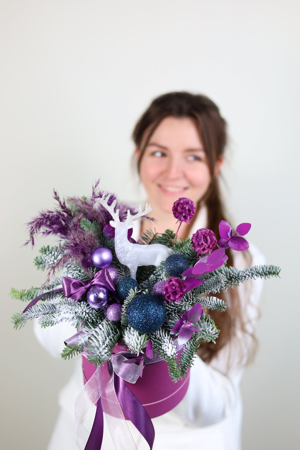 Состав: натуральный нобилис и шишки, эвкалипт, новогодний декор, фигурка оленя. Высота около 35 см.