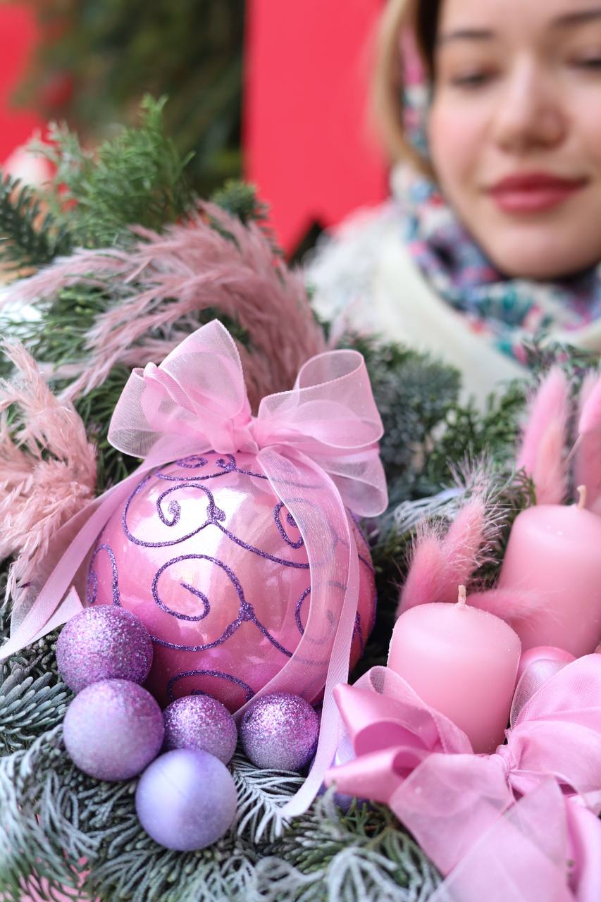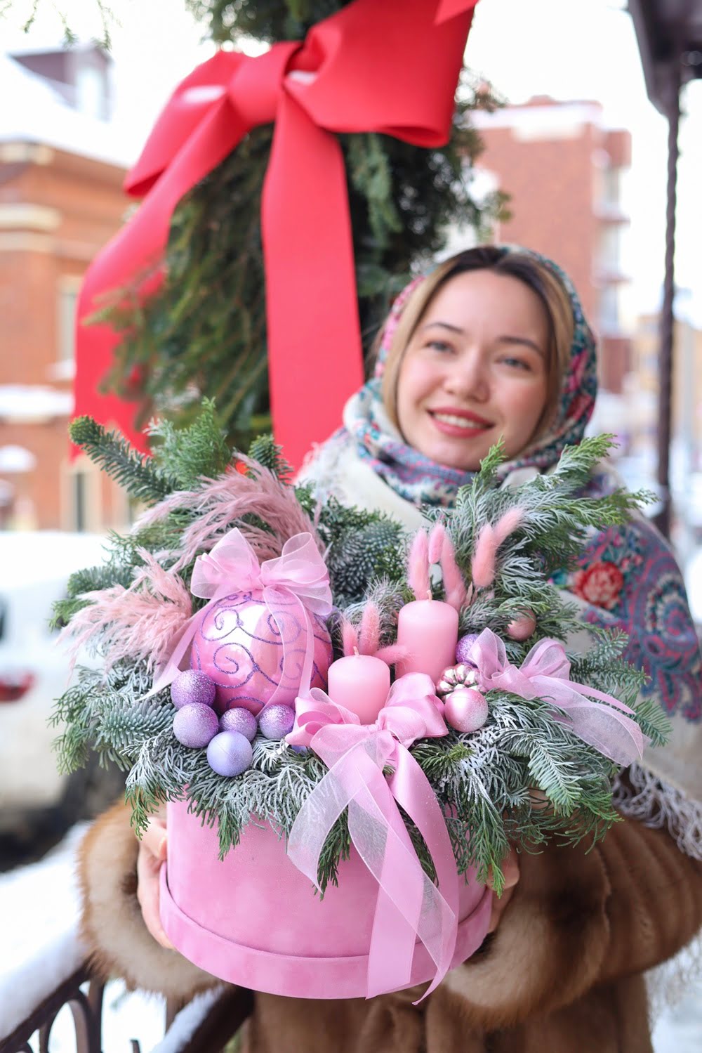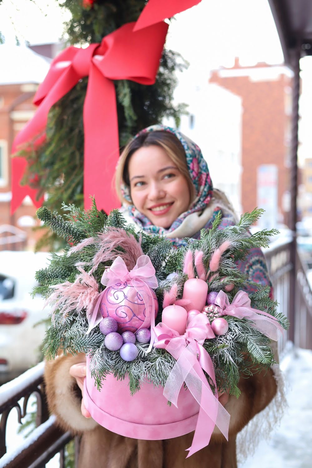 Состав: елочные игрушки, сухоцветы, свечи, ароматная ель нобилис.