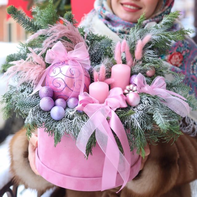 Волшебная новогодняя композиция в бархатной шляпной коробке.
