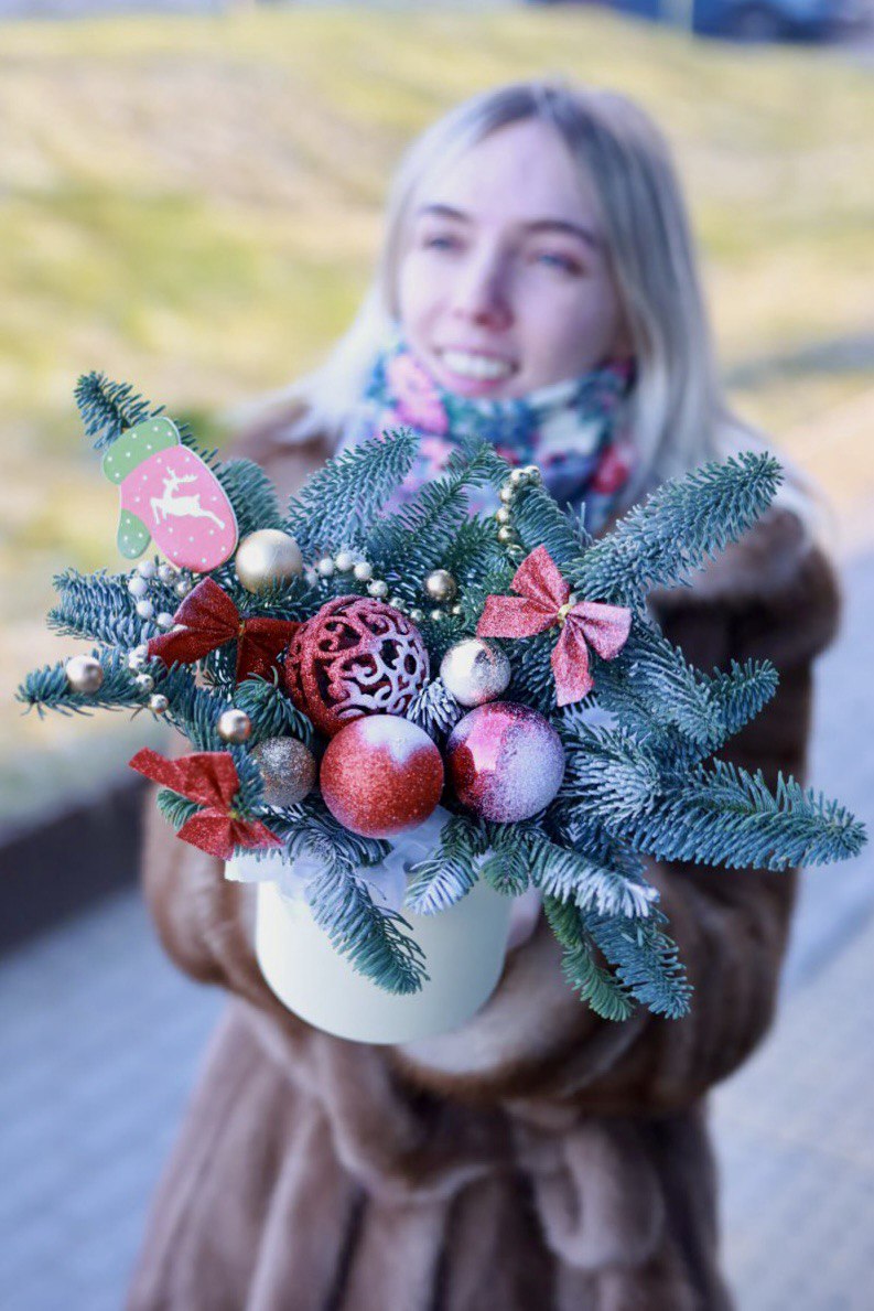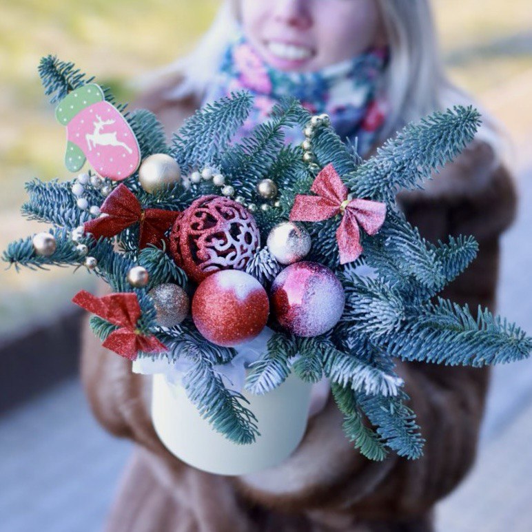 Красивая зимняя композиция в алой гамме в шляпной коробке.