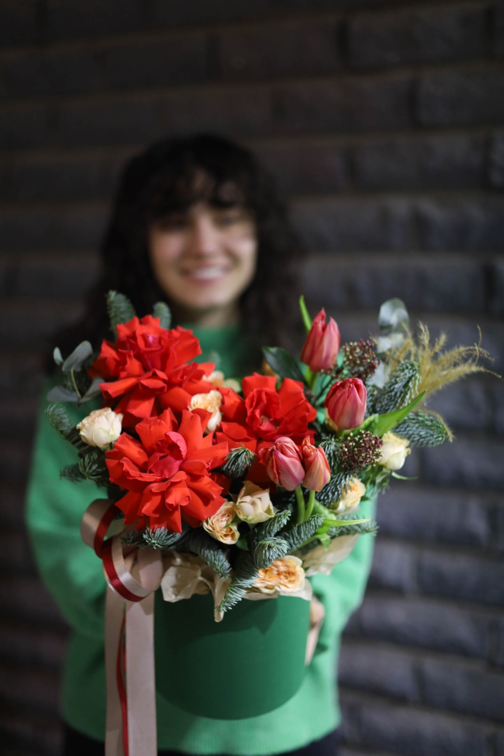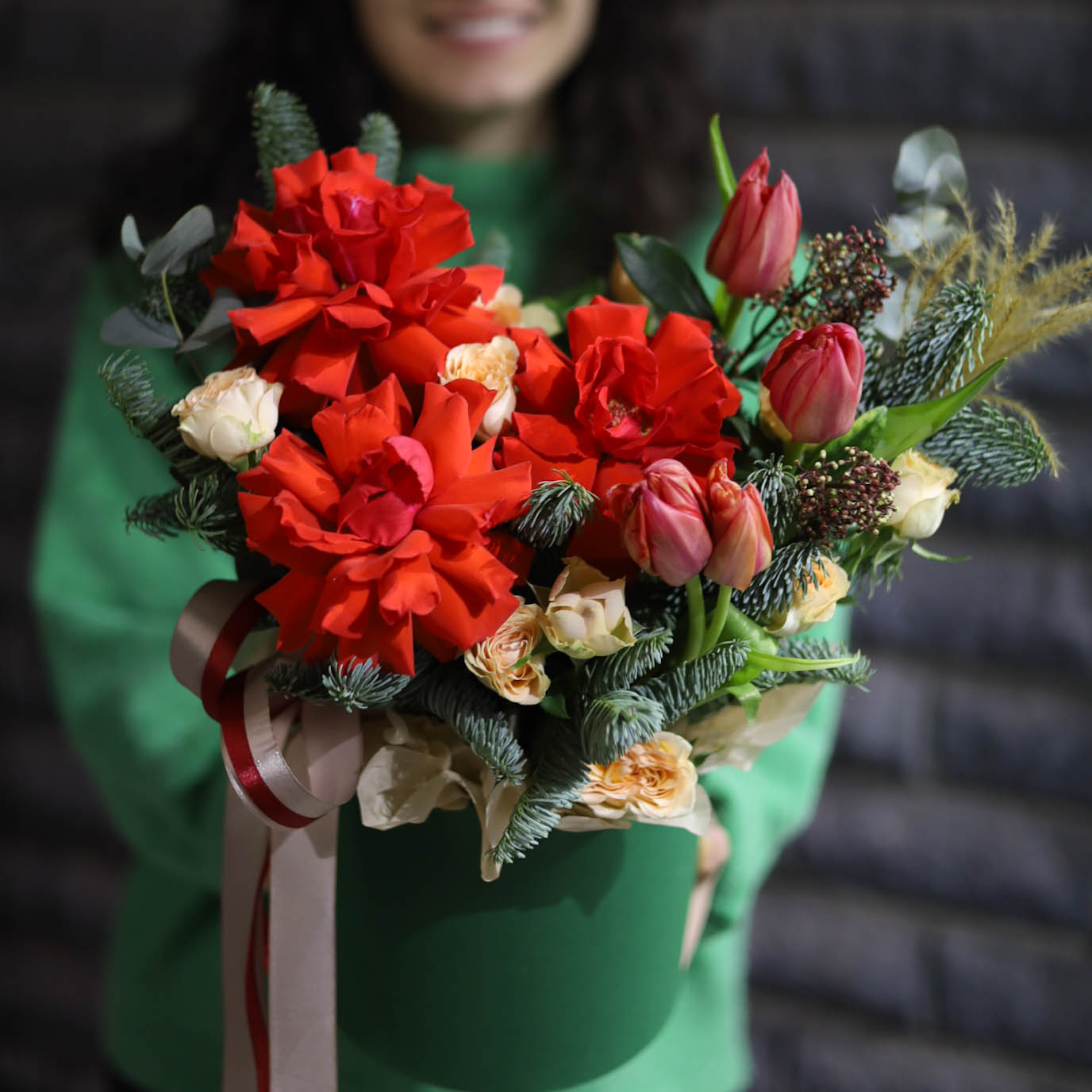 Потрясающая композиция в зимней стилистике с крупными бордовыми розами, тюльпанами, датской елью, кустовыми розочками, сухоцветами.