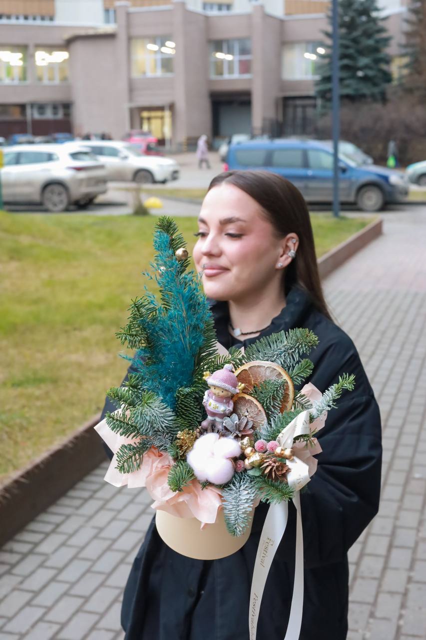 Красивая новогодняя композиция в розовой гамме в шляпной коробке.